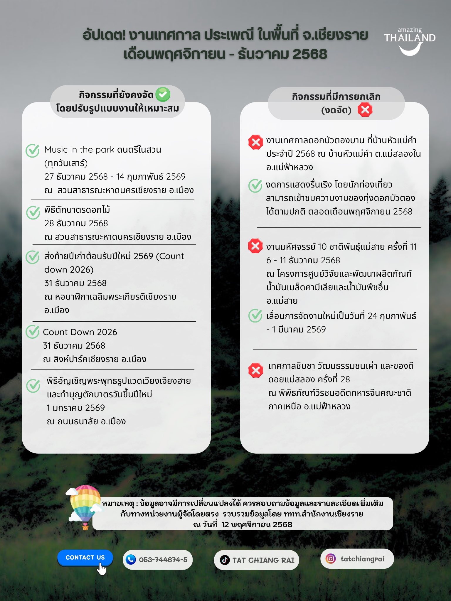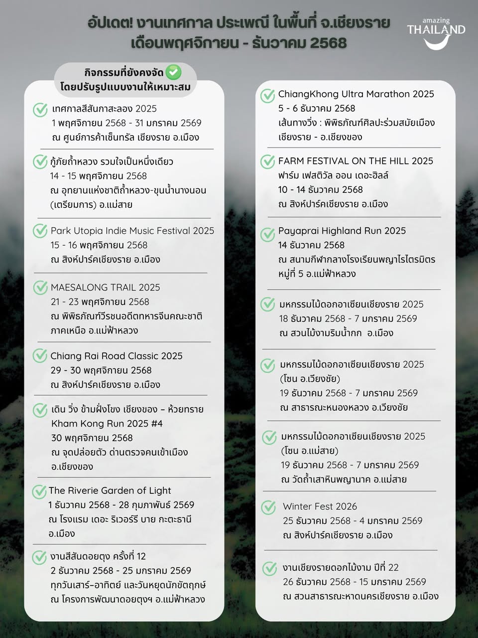 งานมหัศจรรย์ 10 ชาติพันธุ์แม่สาย ครั้งที่ 11 6 – 11 ธันวาคม 2568 เลื่อนการจัดงานใหม่เป็น วันที่ 24 กุมภาพันธ์ – 1 มีนาคม 2569