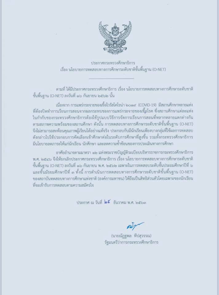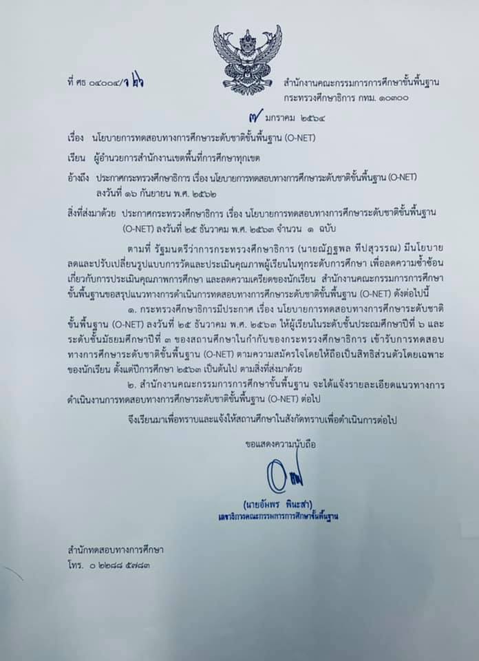 2.หนังสือ สพฐ.ที่ 04004/ว26 เรื่อง นโยบายการทดสอบทางการศึกษาระดับชาติขั้นพื้นฐาน (O-NET) ลงวันที่ 7 มกราคม 2564 ตามที่ได้มีประกาศกระทรวงศึกษาธิการ เรื่อง นโยบายการทดสอบทางการศึกษาระดับชาติขั้นพื้นฐาน (O-NET) ลงวันที่ 16 กันยายน 2562 นั้น แต่เนื่องจากการแพร่กระจายของเชื้อไวรัสโคโรน่า 2019 (COVID-19) มีสถานศึกษาหลายแห่งที่ต้องปิดทำการเรียนการสอนจากผลกระทบของการแพร่กระจายของเชื้อโรค ซึ่งสถานศึกษาแต่ละแห่งในกำกับของกระทรวงศึกษาธิการต้องใช้รูปแบบวิธีการจัดการเรียนการสอนที่หลากหลายแตกต่างกันตามสภาพความพร้อมของสถานศึกษา