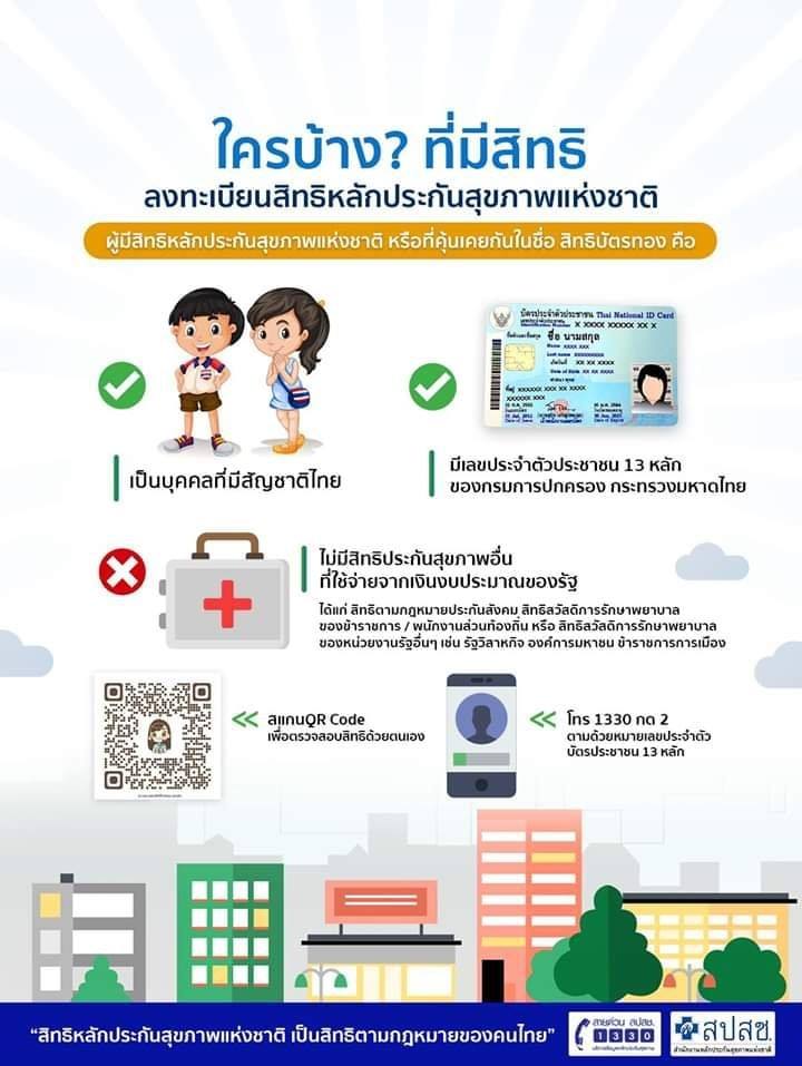 ใครบ้าง? ที่มีสิทธิรักษาพยาบาล ตามสิทธิหลักประกันสุขภาพแห่งชาติ (สิทธิบัตรทอง) มีสัญชาติไทย มีเลขประจำตัวประชาชน 13 หลัก ไม่มีสิทธิรักษาพยาบาลอื่น ที่รัฐจัดให้ เช่น สิทธิประกันสังคม สิทธิข้าราชการ ฯลฯ