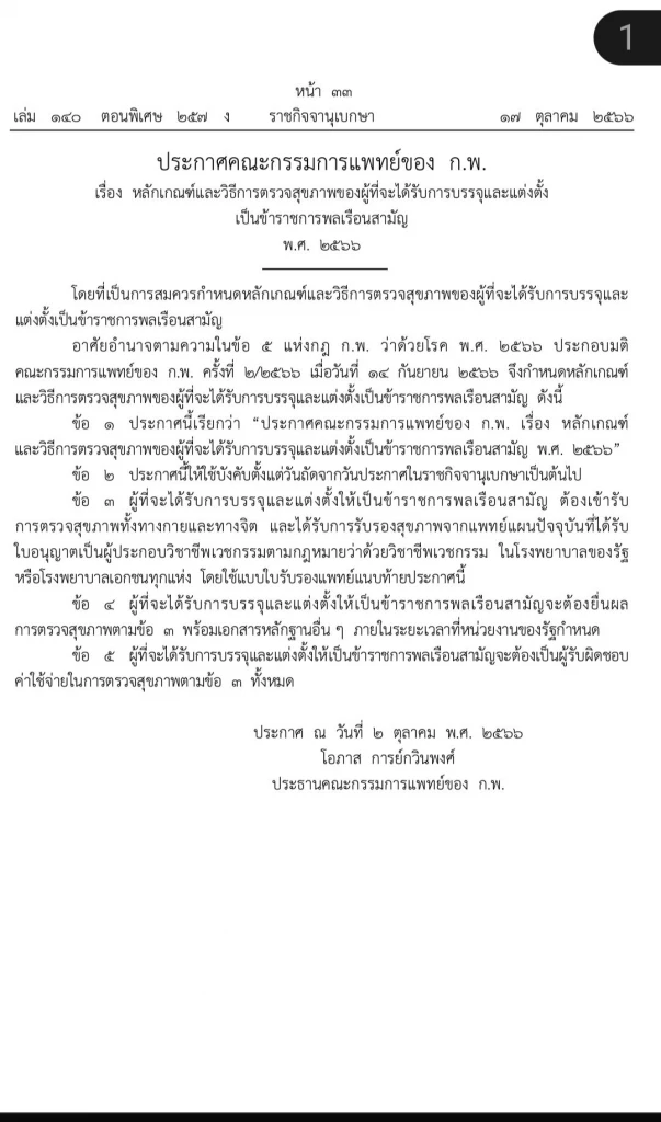 ราชกิจจานุเบกษา เผยแพร่ ประกาศคณะกรรมการแพทย์ของ ก.พ. เรื่อง หลักเกณฑ์และวิธีการตรวจสุขภาพของผู้ที่จะได้รับการบรรจุและแต่งตั้ง เป็นข้าราชการพลเรือนสามัญ พ.ศ. 2566